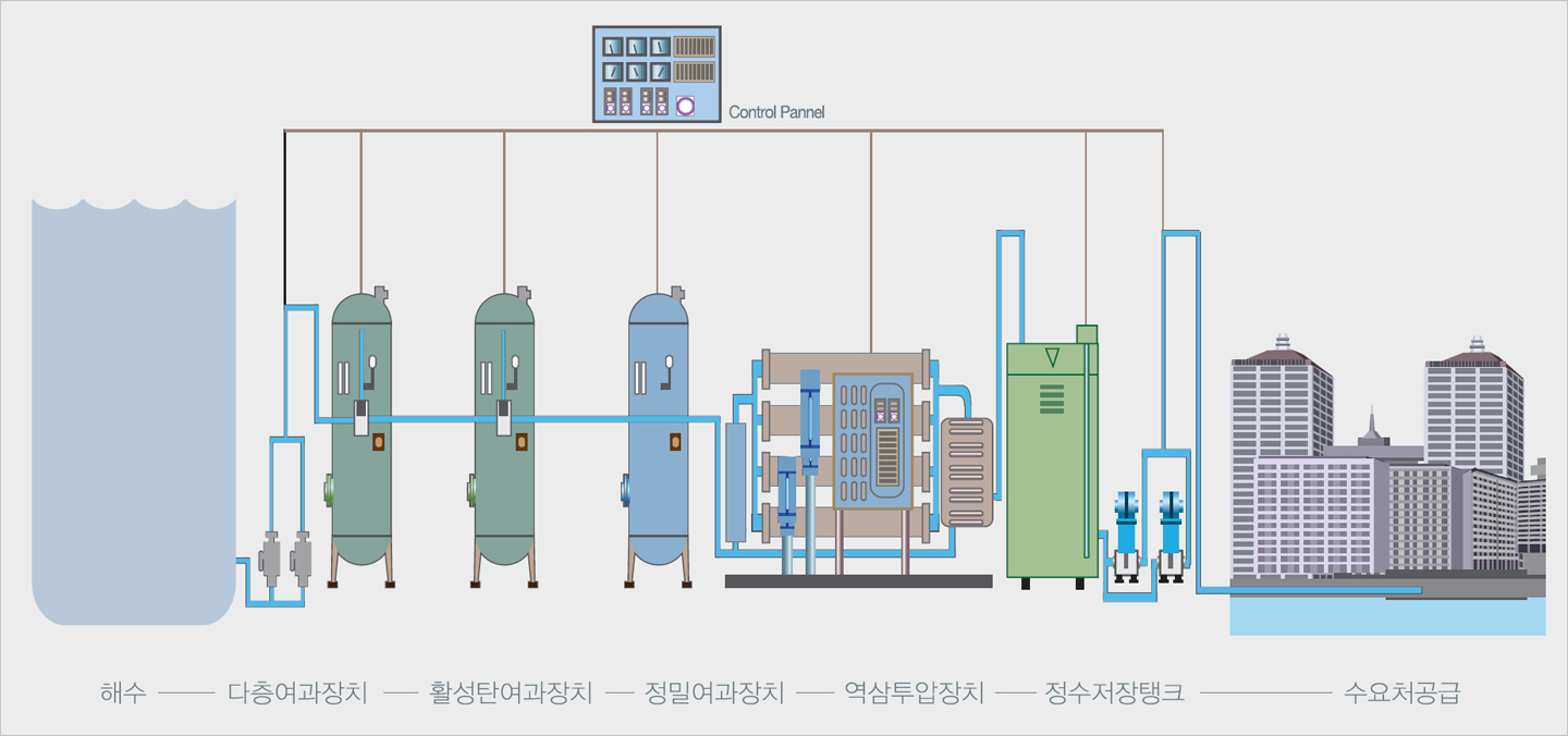 ¹Ù´å¹°¿¡¼ ¿°ºÐ°ú À¯±â¹°Áú µîÀ» Á¦°ÅÇØ ½Ä¼ö³ª »ýȰ¿ë¼ö µîÀ¸·Î ÀÌ¿ëÇÒ ¼ö ÀÖµµ·Ï ´ã¼ö¸¦ ¾ò´Â °ÍÀ» ¸»ÇÑ´Ù. ÇØ¼ö¸¦ Áõ¹ß½ÃÄÑ ¿°ºÐ°ú ¼öÁõ±â¸¦ ºÐ¸®ÇÏ´Â Áõ¹ß¹ý, ¹°Àº Åë°ú½ÃŰ°í ¹° ¼Ó¿¡ ³ì¾Æ ÀÖ´Â ¿°ºÐÀº °É·¯³»´Â ¿ª»ïÅõ¾Ð ¹æ½Ä µîÀÌ ÀÖ´Ù. Áõ¹ß¹ýÀº ¿ª»ïÅõ¾Ð¹ý¿¡ ºñÇØ ¿¡³ÊÁö ¼Òºñ·®ÀÌ 3¹è³ª ´õ ¸¹±â ¶§¹®¿¡ ¿øÀ¯ °¡°ÝÀÌ ¾ÈÁ¤ÀûÀÎ Áßµ¿ Áö¿ªÀ» Á¦¿ÜÇϸé ÁÖ·Î ¿ª»ïÅõ¾Ð ¹æ½ÄÀÌ ³Î¸® ÆÛÁ® ÀÖ´Ù.
